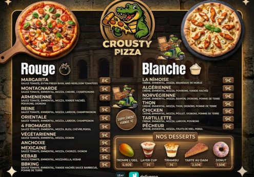 ILaissez-vous tenter par nos recettes authentiques 100% Halal. Chez Crousty Pizza, nous utilisons des ingrédients frais et de premier choix pour vous offrir la vraie saveur d'une pizza Nîmes. De notre pâte faite maison préparée chaque jour, à notre sauce tomate signature et notre crème onctueuse, chaque bouchée est une expérience inoubliable. Vous cherchez une pizza nimes near me ? Nous sommes là pour vous régaler !